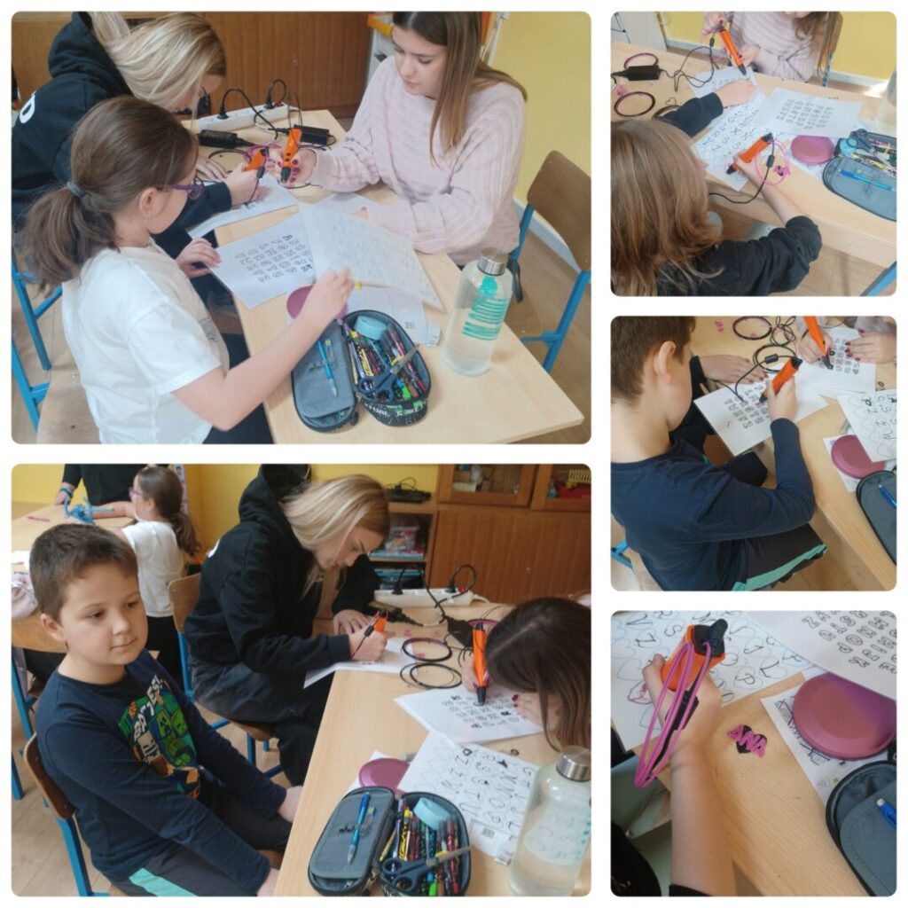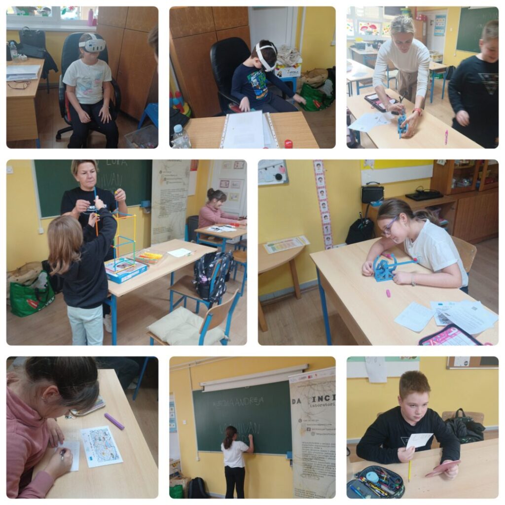 U kombiniranom razrednom odjelu učenici 1. i 4. razreda bili su na interaktivnom i kreativnom putovanju Da Vincijevim izumima. Na radionici su koristili didaktičke materijale, 3D olovke i tehnologiju virtualne stvarnosti za razvoj timskog rada, mašte i znatiželje. Predavačice su upoznale učenike sa životom i radom Leonarda da Vincija, pokazale su 3D modele nekih njegovih izuma (krila, tenk, helikopter, katapult, drveni most). Na zanimljiv način objasnile su učenicima kako je da Vinci bio ambidekster te su se učenici okušali u pisanju svoga imena unazad te pisanju svoga imena s obje ruke istovremeno. Učenici su imali prilike isprobati katapult, izraditi svoje ime pomoću 3D olovke, obići svemir i svemirsku postaju pomoću VR naočala. Učenica 1. razeda slagala je svoj neobični 3D izum pomoću modela štapića.
