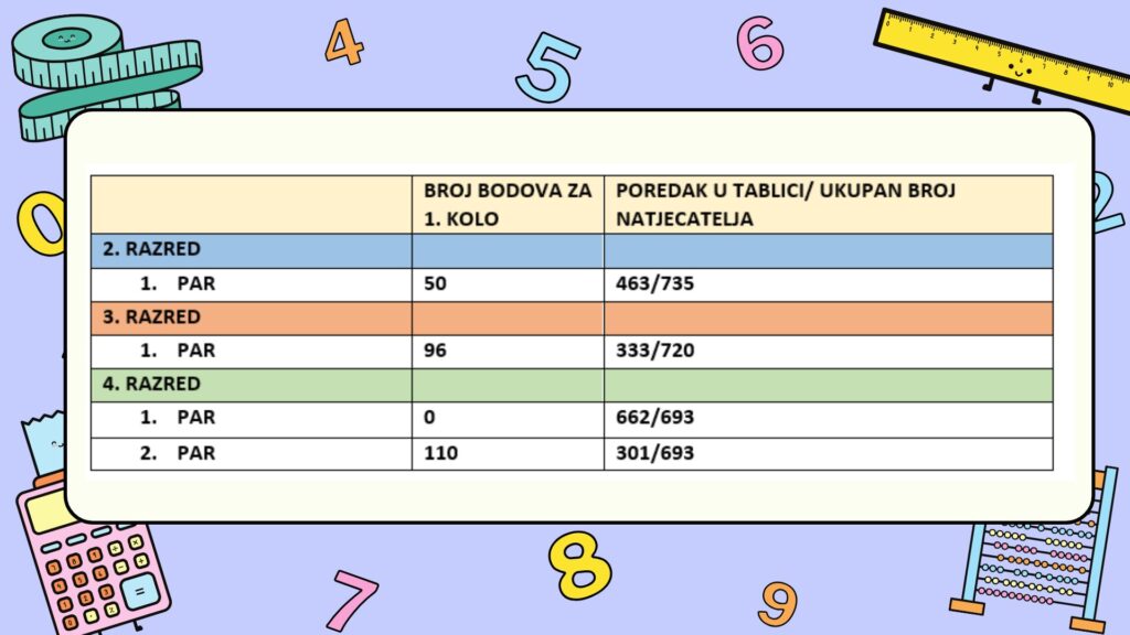 Ove godine naša škola je na natjecanje prijavila 4 para. Iz PO Kućanci natječe se par iz drugog (Lucia Filipovska i Noa Živković) i trećeg razreda (Anamarija Litrić i Stjepan Vinković). Dva para četvrtog razreda se natječu iz PŠ Marijanci (Leona Pandrurić i Matej Palčok te Barbara Staklarević i Meri Čvangić).