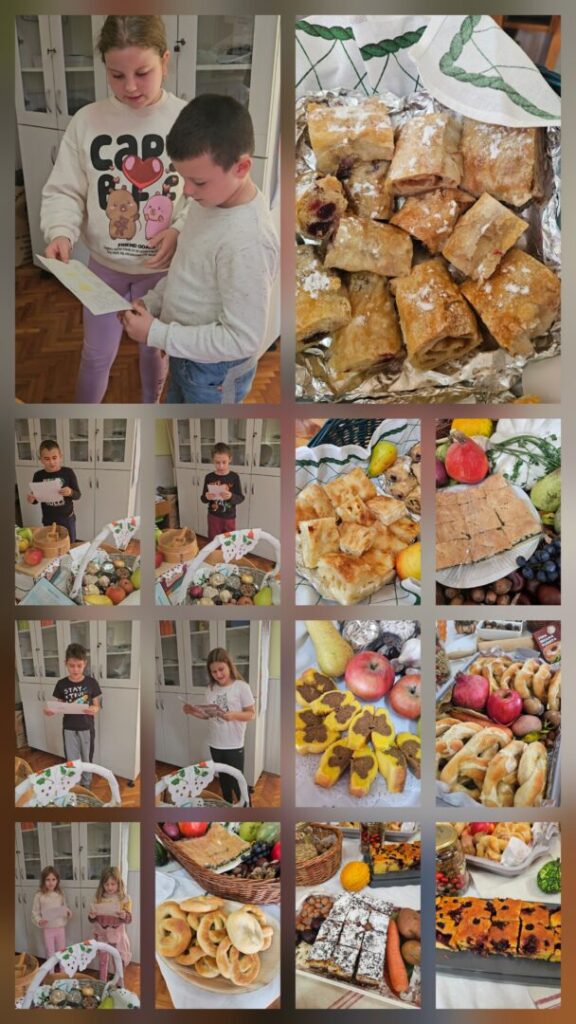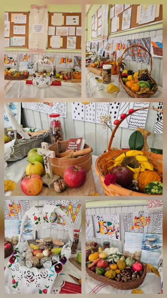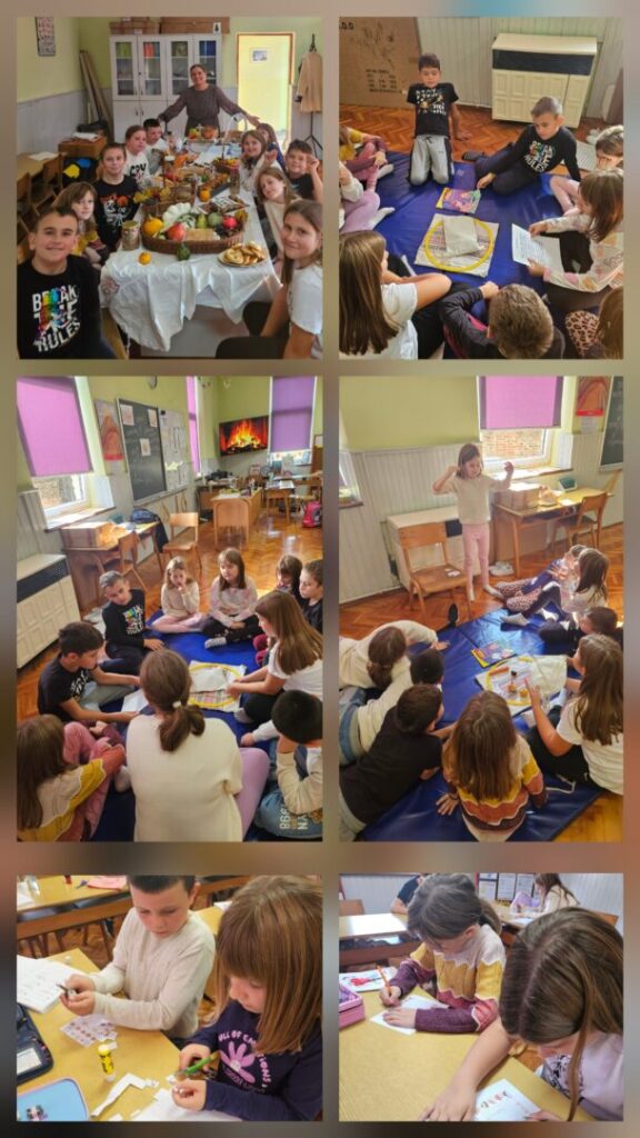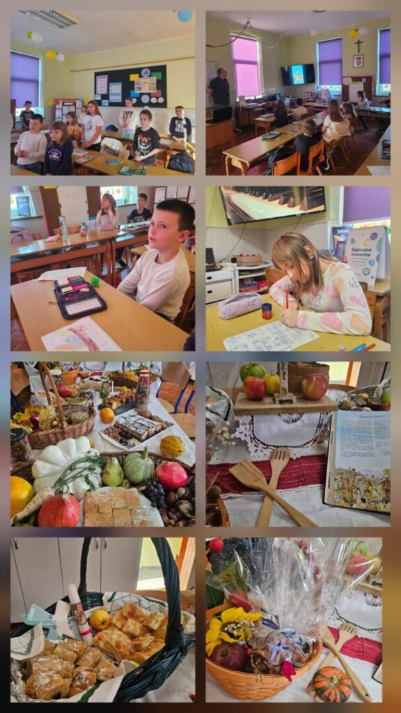 U petak, 17. listopada, obilježili smo DANE KRUHA I ZAHVALNOSTI ZA PLODOVE ZEMLJE. U suradnji s našim vjeroučiteljem Marinelom integrirali smo nastavu vjeronauka, hrvatskog jezika i sata razrednika te proveli brojne aktivnosti. Dan smo započeli molitvom Oče naš, videom „Isus hrani mnoštvo“ nakon čega je uslijedio razgovor o važnosti kruha, dijeljenja i odgovornog ponašanja s hranom. Nakon rješavanja i bojanja prikladnih listića, zapisali smo na ploču sve ideje koje su učenici izrekli uz pojam KRUH. Kroz prezentaciju o nastanku, vrstama, izradi kruha pogledali smo i zanimljive video prikaze. Učenici su otpjevali pjesmice Mlin i Pekar koje su usvojili ranije na satu glazbene kulture. U suradnji s roditeljima učenici su dan ranije izradili svoje kolače, zapisali recepte te ih donijeli u školu. Uz pripremljen izložbeni stol s kolačima i plodovima jeseni učenici su čitali svoje recepte. Nakon izložbe uslijedilo je zajedničko blagovanje. Poslije odmora učenici su jedva dočekali natjecateljsku igru Alias zahvalnosti gdje su kroz glumu i zabavuponovili o naučenome. Vrlo zainteresirani tražili su i „listić više“, no tjednu je brzo došao kraj. Sitih stomačića s osmjehom na licu, ponijeli su paketiće kolača svojim obiteljima. Jer, naučili smo: „ Hranu ne smijemo bacati! “