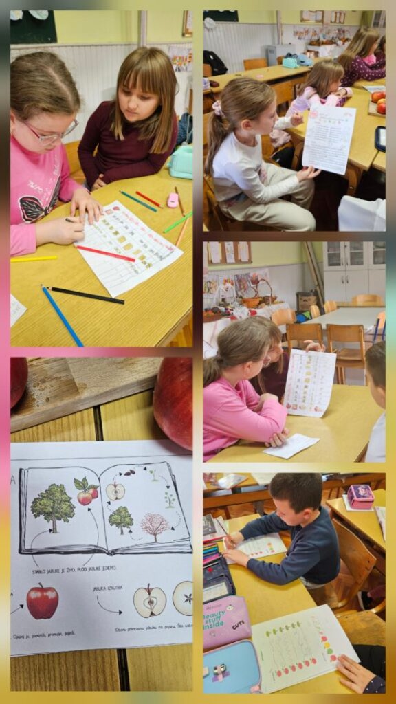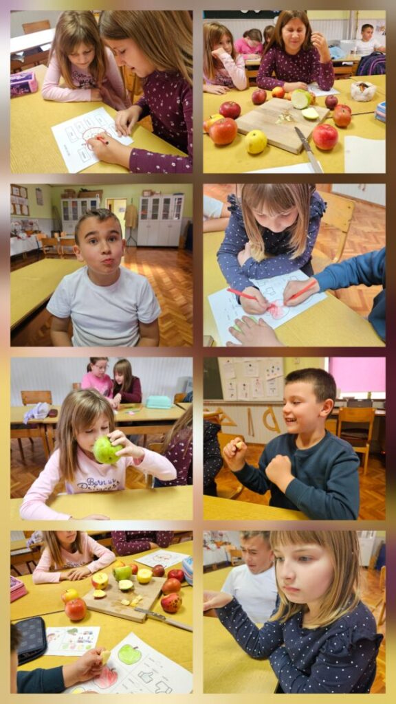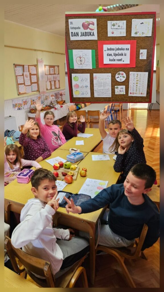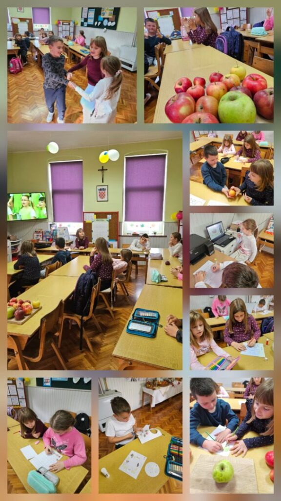 U ponedjeljak, 20. listopada, kroz sat razrednika obilježili smo DAN JABUKA. Razgovarali smo o važnosti jabuke za zdravlje čovjeka, saznali smo nešto i o sortama jabuka, otpjevali pjesmu Jabuko jabučice te otplesali Kruška, jabuka, šljiva. Uslijedili su zadatci koje su učenici samostalno ili u parovima rješavali ( Boje jabuka; Isprobavanje okusa različitih vrsta jabuka; Prikaz podataka omiljenog proizvoda od jabuka; Od sjemenke do tvornice; Dijelovi jabuke; Recept za kolač od jabuka) i na kraju sata predstavili. Uredili smo pano s naglaskom na izreku: „ Jedna jabuka na dan, liječnik iz kuće van! „