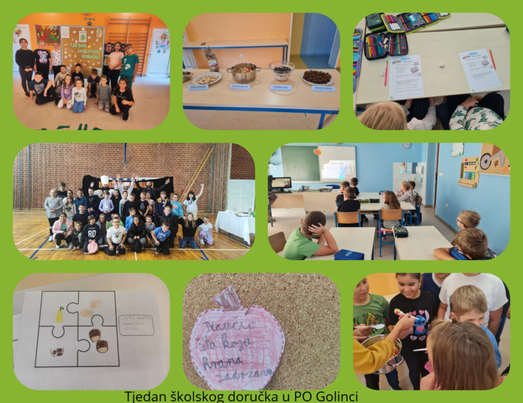 Učenici i učiteljice Područnog odjela Golinci su svaki dan radili neku aktivnost. U ponedjeljak su pričali o doručku, što oni doručkuju, ispunili anketu o doručku, razgovarali o važnosti raznolikog doručka koji obuhvaća 4 skupine namjernica, crtali su svoje doručke u koje su ubacili barem tri različite skupine namirnica. U utorak su pogledali prezentaciju o doručcima u svijetu. U srijedu su posjetili matičnu školu u Magadenovcu gdje su pogledali edukativnu predstavu Kuhari. Četvrtak je bio rezerviran za kušanje novih namirnica- kus kus salata, zobena kaša, banana kruh, guacamola namaz, kikiriki maslac, humus namaz, rižini krekeri, tofu i pistacija maslac. Nakon ispunjene evaluacije zaključili su da im se najviše svidio banana kruh, humus namaz i rižini krekeri, a najmanje tofu. Petak su pogledali film o celijakiji te pričali o intoleranciji na neke namirnice i alergijskim reakcijama na određenu vrstu hrane, te kako se ponašati, ako znamo da netko ima poteškoće s hranom. Kraj projekta je bio rezerviran za izradu panoa zahvalnosti na koji su pisali riječi zahvale tetama kuharicama, a zapisivali su i što su novo naučili u ovome tjednu. Za kraj smo ispunili i evaluaciju o tome kako nam se svidio ovaj tjedan.