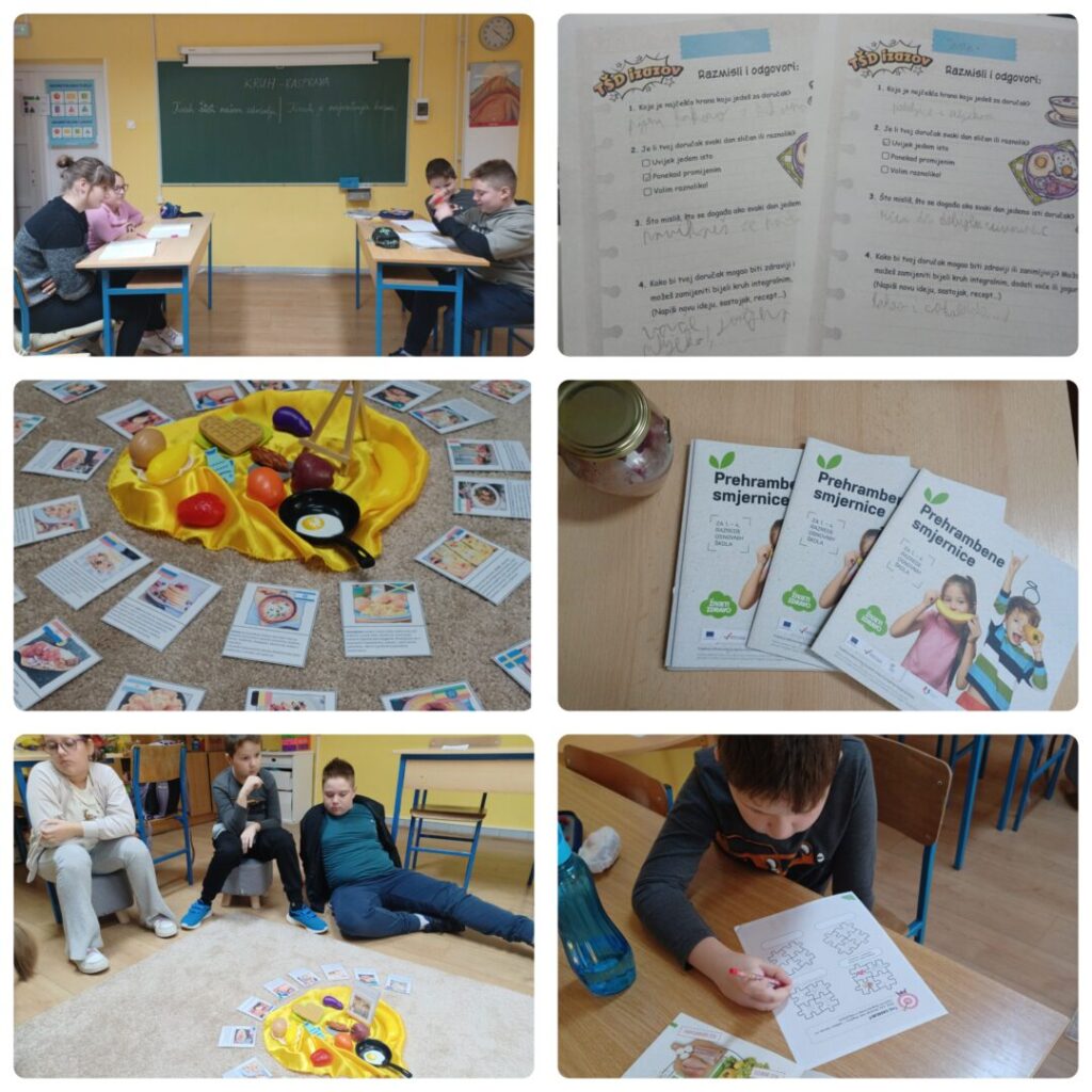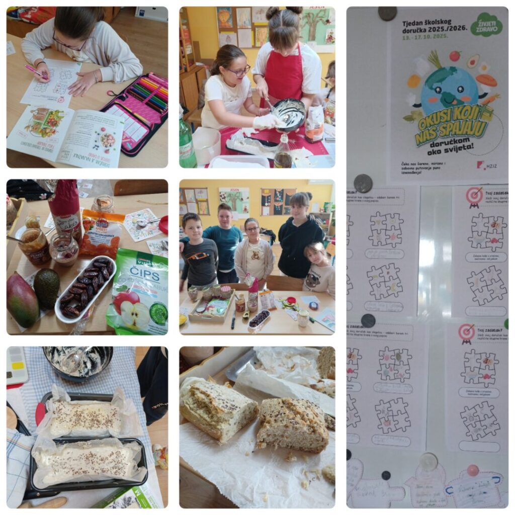 Tjedan školskog doručka u 1. i 4. razredu matične škole započeli smo ispunjavanjem kratkog upitnika o prehrambenim navikama učenika. Putem kratkog edukativnog filma „Ona uvijek nešto glumata“ upoznali smo se s bolesti celijakijom te njezinim simptomima. Nakon toga organizirali smo kratku raspravu o kruhu. Jedna skupina učenika zastupala je tezu da je kruh najzdravija hrana, a duga da kruh šteti našem zdravlju. Putem edukativnog plakata upoznali smo se s popularnosti doručka kroz vrijeme. Kroz pripremljene kartice u Montessori vježbi tišine, upoznali smo se sa različitim doručcima u svijetu. Učenici su saznali kako izgleda školski doručak diljem svijeta te su raspravljali o tome koji im se doručak sviđa, a koji baš i ne. Školska knjižničarka podijelila je učenicima zanimljive knjižice koje su im poslužile za slaganje vlastitih zdravih doručaka. Također, na sat je učenicima donijela pripremljenu zobenu kašu s bananama, malinama i borovnicama te smo kušali i ocjenjivali isprobano. Učenicima se najviše svidjela aktivnost isprobavanja novih namirnica. Svaki učenik donio je jednu namirnicu koju nikad nije isprobao te je slijedilo zajedničko kušanje. Bilo je tu svega: avokada, manga, datulja, sušenih marelica, čipsa od jabuke, rižinih krekera i kikiriki maslaca,… Učenici su svaku namirnicu pomirisali, ocijenili izgled te na kraju kušali. Uvjerljivu pobjedu odnijeli su rižini krekeri s kikiriki maslacem. Podijeljeni u dvije skupine, učenici su ispekli dvije zdravije verzije kruha – integralni pšenični kruh te raženi kruh sa sjemenkama kojeg su tijekom odmora podijelili učenicima viših razreda.