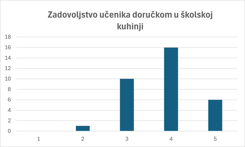 Također, u sklopu Tjedna školskog doručka provedena je kratka anketa na razini matične škole u kojoj se željelo ispitati koliko su učenici zadovoljni trenutnom ponudom doručka u školskoj kuhinji. Prosječna ocjena doručka bila je 4. Kao jelo koje im se najviše sviđa u školskoj kuhinji učenici su pisali: pljeskavice, rižoto, roštiljke, ćufte, tijesto s mljevenim mesom, meso u umaku, gulaš, pizza… Od jela koje im se u školskoj kuhinji baš i ne sviđa učenici su izdvojili tjesteninu s tunjevinom, paprikaš, tjesteninu sa sirom i mahune. Jela koja su učenici predložili da bi voljeli vidjeti u školskom jelovniku su: šnicle, pomfrit, špinat, ćevapi, lignje, Cesar salata, lazanje, sarma, palačinke, juha od bundeva…. U posljednjem pitanju da napišu poruku za školske kuharice učenici su u većini pisali pohvale kuharicama te poželjeli da kuharice malo više začine jela.